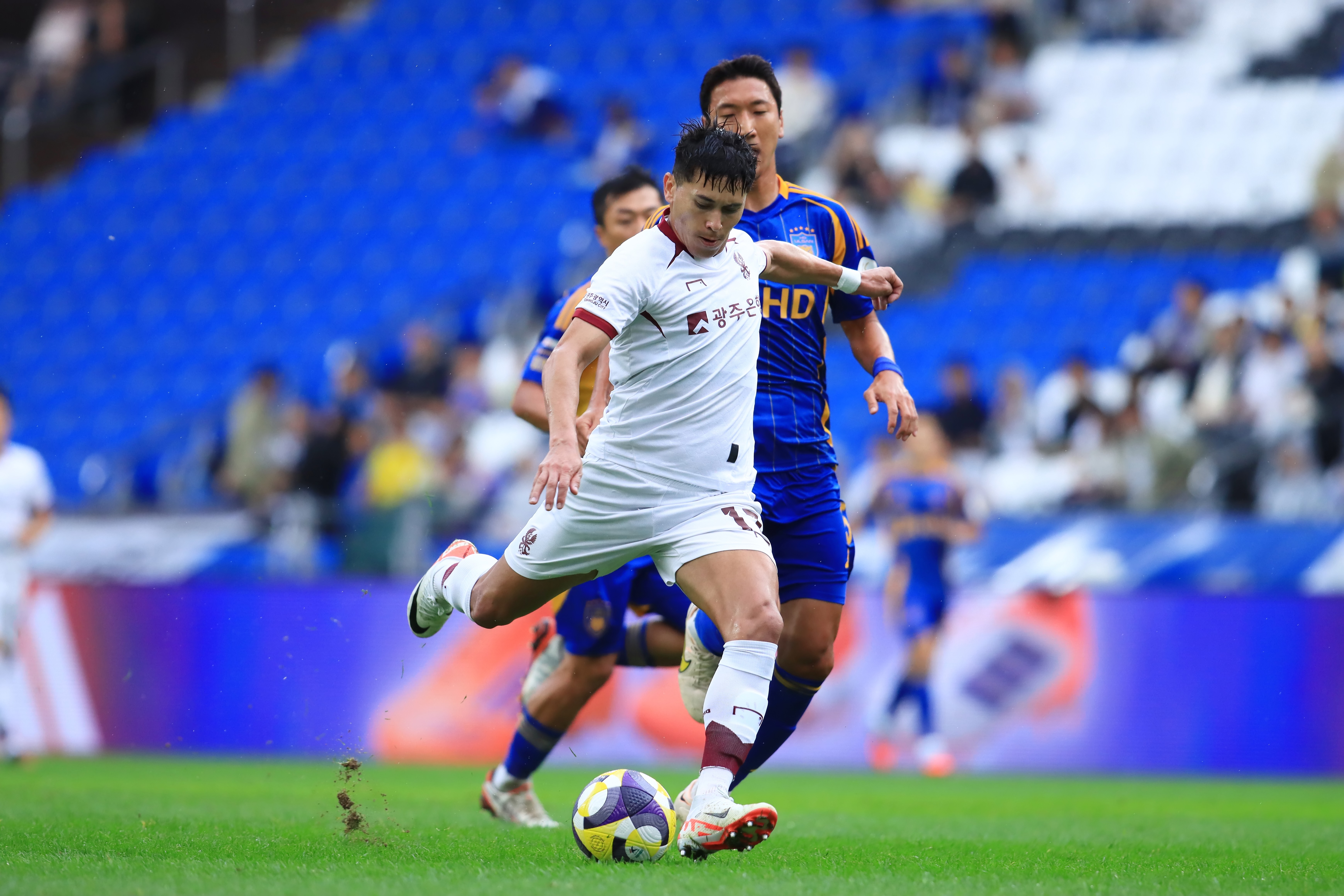 경기 초반 광주가 주도권을 쥔 채 점유율을 늘려갔다. 후방에서 변준수와 이강현이 안정적인 볼 배급으로 흐름을 주도했다. 킥오프 3분 만에 기회가 찾아왔다. 하승운이 박스 안으로 스루패스를 찔렀고 정지훈이 곧바로 오른발 슈팅을 날렸지만, 조현우의 선방에 막혔다. 9분엔 상대 미드필더 정우영의 안일한 볼 처리를 가로챈 광주가 빠른 역습에 나섰고, 헤이스가 과감한 중거리 슈팅으로 연결했다.