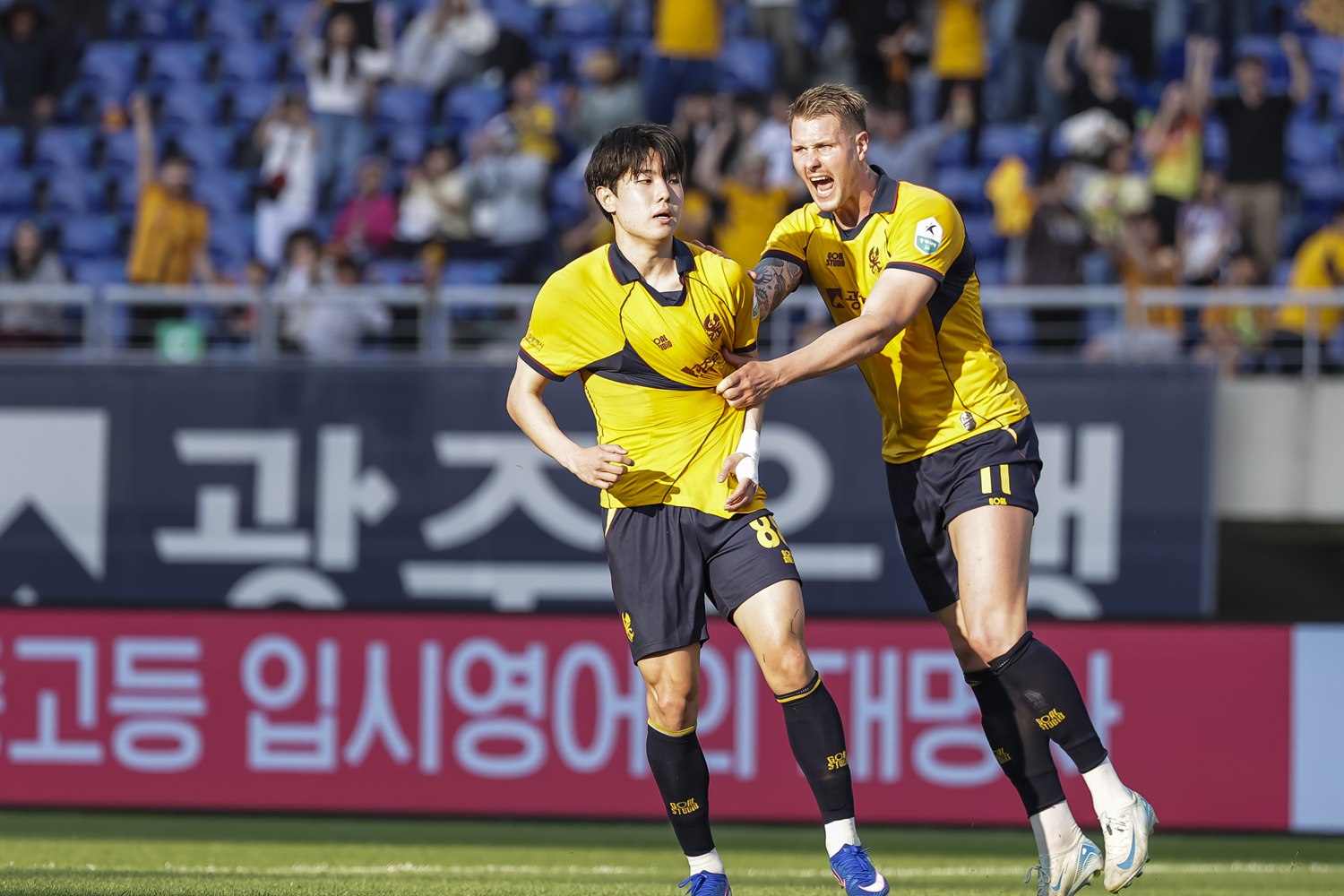 프로축구 광주FC가 26일(일) 16시 30분 광주월드컵경기장에서 열린 FC안양과 ‘하나은행 K리그1 2026’ 10라운드 홈 경기에서 2-5로 패했다. 문민서가 후반 9, 13분 연속골로 따라 잡았으나 아쉽게 승부를 뒤집지 못했다. 광주가 먼저 포문을 열었다. 전반 9분 안혁주의 왼발 중거리 슈팅은 빗나갔다. 그러나 선제실점을 내줬다. 전반 20분 마테우스의 침투패스 시작으로 왼쪽에서 박정훈 크로스를 받은 엘쿠라노가 헤더로 광주 골망을 흔들었다. 이후 광주가 반격했다. 정지훈은 전반 22분 빠르게 돌파하며 때린 오른발 중거리 슈팅을 시도했으나 김정현 태클로 인해 빗나갔다. ![]() 광주는 주세종을 중심으로 기회를 연이어 만들었다. 주세종은 전반 34분 오른발 프리킥, 39분 중거리 슈팅으로 안양 골문을 두들겼으나 김정훈 선방에 아쉬움을 삼켰다. 광주는 전반 종료 직전 연속 실점으로 더 어려움에 빠졌다. 전반 40분 강지훈의 패스를 받은 김정현이 턴 동작으로 안영규를 제친 후 오른발 슈팅을 막지 못했다. 전반 추가시간 2분 우측에서 마테우스 크로스, 엘쿠라노 논스톱 패스를 받은 토마스가 왼발 슈팅으로 인해 세 번째 실점을 허용했다. 전반을 3골 차로 뒤처져진 채 마쳤다. 광주는 후반 시작과 함께 프리드욘슨, 권성윤을 투입하며 일찍 승부를 걸었다. 이는 적중했다. 프리드욘슨이 후반 8분 왼 측면에서 돌파하며 낮게 크로스했고, 문민서가 컷백으로 만회골을 넣었다. ![]() 문민서가 다시 한 번 일을 냈다. 그는 후반 13분 중원에서 헤더로 빠르게 볼을 빼앗았고, 프리드욘슨이 뒤로 살짝 흘렸다. 문민서가 다시 볼을 잡아 오른발 슈팅으로 골 넣으며 한 골 차로 따라 잡았다. 한 번 흐름을 탄 광주의 기세는 무서웠다. 정지훈이 후반 25분 경합 과정에서 흘러나온 볼을 왼발 슈팅으로 이었으나 높이 떴다. 문민서가 후반 27분 시도한 오른발 중거리 슈팅은 김정훈 선방에 막혔다. 광주는 동점골 기회를 계속 만들었다. 정지훈이 후반 36분 역습 기회에서 권성윤의 패스를 오른발 슈팅으로 이었으나 높이 떴다. 그러나 후반 40분 아일톤의 중거리 슈팅은 김경민 선방에 걸렸지만, 세컨볼을 잡은 김운의 슈팅을 막지 못하며 다시 2골 차로 격차가 벌어졌다. 광주는 마지막까지 희망을 잃지 않고, 안양을 밀어 붙였다. 후반 추가시간 5분 역습 위기에서 아일톤에게 추가 실점하며 2-5로 패배했다. |